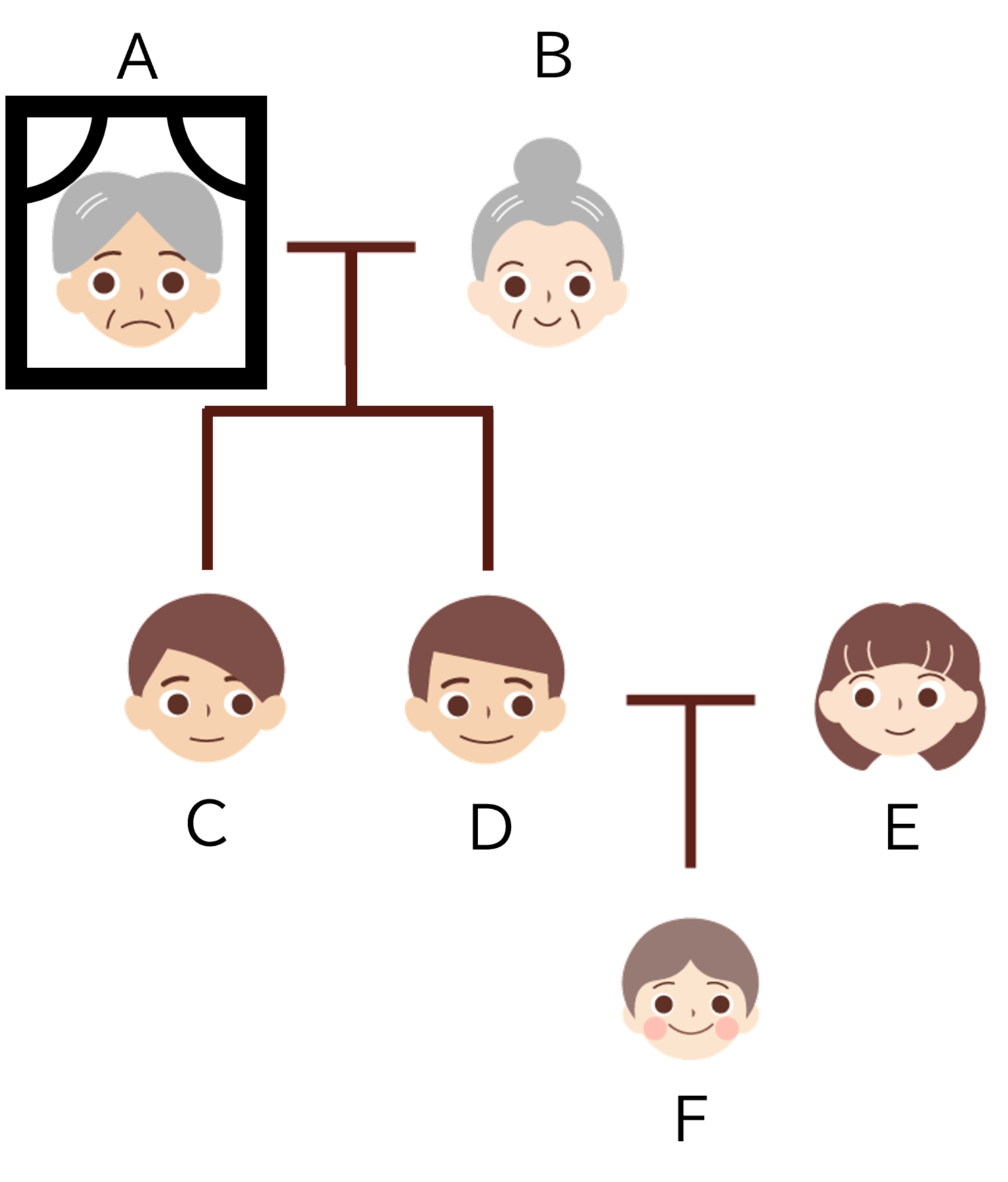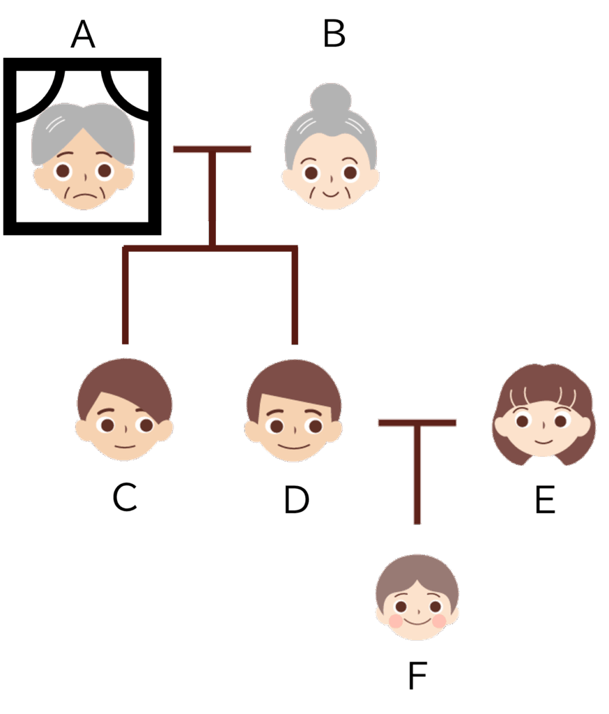 具体的な例でみてみましょう。このイラストのご家族でAさんが亡くなった場合、配偶者であるBさん、子であるCさんとDさんが相続人になります。Dさんの妻であるEさん、Dさんの子でAさんの孫であるFさんは相続人にはなりません。