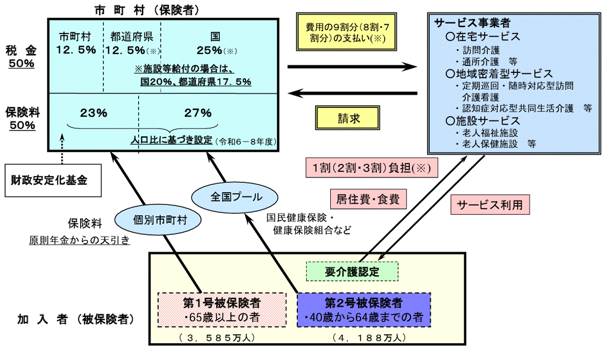 冒頭の「40歳になると給与明細の~」というのは、これが理由です。自営業などの方は、国民健康保険の保険料と合わせて介護保険料も納めます。現在の制度では40歳から亡くなるまで、介護保険料を納め続けることになります。