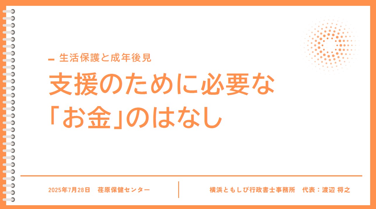 「支援のために必要な『お金』のはなし」と題して、生活保護制度と成年後見制度の基本的な事項と、実際に制度を利用する際の注意事項などについてお話しさせていただきました。